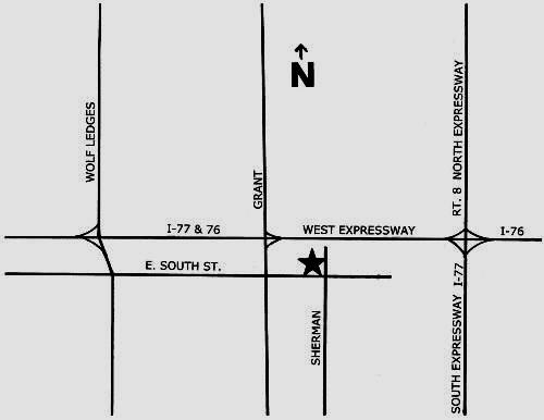 FROM WEST: Take I-76 east, Get off Exit 22B Wolf Ledges/Grant St., Go to top of ramp and turn right on Wolf Ledges, Go approximately 200 ft., Turn left on E. South St. Go two blocks and look left, Business and parking at corner of E. South & Sherman